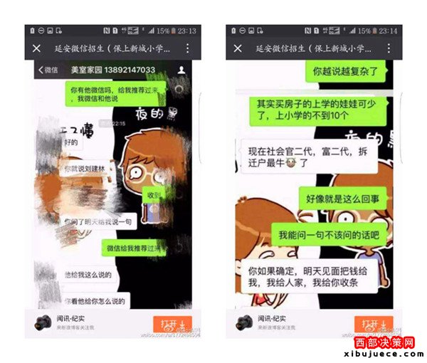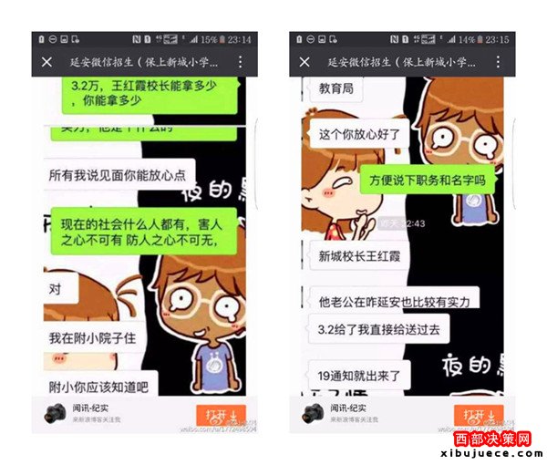 近日,一則題為《延安微信招生(3.2萬(wàn)保上新城小學(xué))請(qǐng)相關(guān)部門給予調(diào)查公布真相》的帖子在朋友圈瘋傳,內(nèi)容是一位微信名叫“延安微信招生(保上新城小學(xué))”的微友,聲稱只要花3.2萬(wàn)元,保證可以在新區(qū)小學(xué)入學(xué),并解釋有中間人,錢并不是直接給校長(zhǎng)王紅霞,但愿意提供自己的車號(hào)、身份證號(hào)、家庭住址等信息作為擔(dān)保。3.2萬(wàn)真的能夠保上延安新區(qū)小學(xué)嗎?事情真相究竟如何,記者展開調(diào)查。