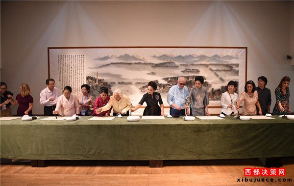 在觀看“意象中國(guó)”書畫展時(shí),彭麗媛和來(lái)賓們?cè)凇段飨o(jì)勝圖》、《朱荷圖軸》等經(jīng)典國(guó)畫作品前駐足觀看,接著欣賞4位著名書畫家現(xiàn)場(chǎng)聯(lián)袂創(chuàng)作書畫作品《江南憶》。一位書法家還為來(lái)賓們現(xiàn)場(chǎng)示范毛筆的執(zhí)筆、運(yùn)筆方式。彭麗媛邀請(qǐng)來(lái)賓們一同書寫漢字“和”。她說(shuō),“和”字在漢語(yǔ)里具有“和平”、“和諧”之義,是我們對(duì)世界的共同心愿。來(lái)賓們饒有興致地拿起毛筆各自書寫,并展示自己的書法作品。彭麗媛說(shuō),昨晚各位在西湖邊觀看了精彩的文藝演出,今天我們?cè)谶@里一同欣賞畫中的西湖。她同來(lái)賓們?cè)趪?guó)畫《西湖秋勝》前合影留念。