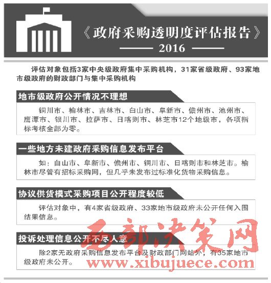 《報(bào)告》披露:我國(guó)政府采購(gòu)信息公開情況仍不理想。主要表現(xiàn)為:地市級(jí)政府公開情況不佳。其中,陜西省銅川市、榆林市、吉林省吉林市、白山市、遼寧省阜新市、海南省儋州市、安徽省池州市、江西鷹潭市、寧夏銀川市以及西藏拉薩市、日喀則市和林芝市等12個(gè)地級(jí)市,在政府采購(gòu)信息透明度各項(xiàng)指標(biāo)考核中全部為零分,在93家地市級(jí)政府成績(jī)排比中墊底。