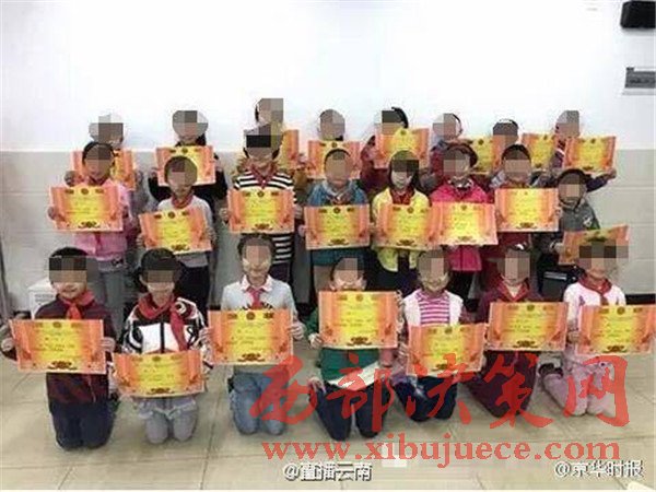 昨天有微博爆料,云南省昆明市盤龍區(qū)東莊小學獲獎學生合照中,7名學生手持獎狀跪在地上。圖片引發(fā)網友爭議。該校校長回應稱,照片為領獎后在辦公室內拍攝,受空間限制,部分學生跪地。昆明市盤龍區(qū)教育局則表示,已收到學校報告,之后會提出處理意見。