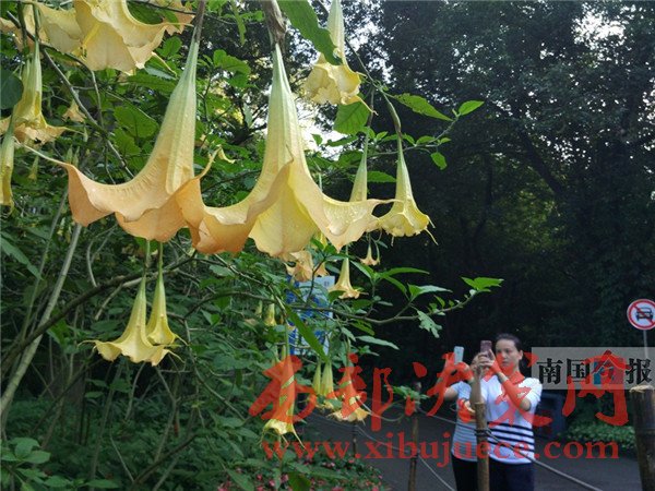 “南瓜花不是長(zhǎng)在藤蔓上的嗎,怎么這些‘南瓜花’都倒吊著長(zhǎng)在了樹枝上?”昨日,柳州市龍?zhí)豆珗@里的不少游客,都被路旁一種奇異的開花樹木所吸引,紛紛駐足觀賞拍照。記者了解到,那是公園新近引種的木本曼陀羅,因?yàn)閷儆谟卸局参?,市民前往觀賞時(shí),最好眼看手勿動(dòng)。