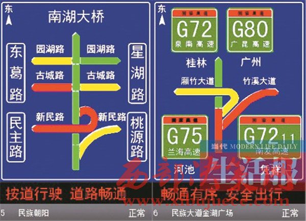 “至埌東客運站旅行時間5分鐘”的提示,同時顯示周邊多條道路都是綠色……駕車在民族大道上會看到類似這樣的提示,這是南寧交警部門與高德地圖合作的成果。目前,高德地圖提供的實時路況交通信息已經(jīng)陸續(xù)上線南寧市交通誘導屏。在民族大道沿線的60塊誘導屏,均可以清楚地反映實時路況信息和道路擁堵狀況。