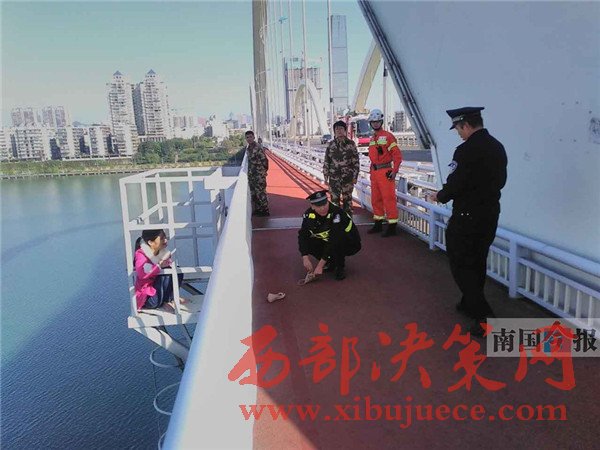 “阿建怎么還沒(méi)到?”下午5時(shí)許,阿婷的體力已接近透支,嘴唇干裂發(fā)紫,身體也有些哆嗦,見(jiàn)阿建還沒(méi)現(xiàn)身,突然又激動(dòng)起來(lái),聲稱要立即跳橋,隨即從小平臺(tái)的護(hù)欄間隙爬出,并松開(kāi)左手轉(zhuǎn)身朝外,整個(gè)身體懸空在水面上,眼看就要掉下去。