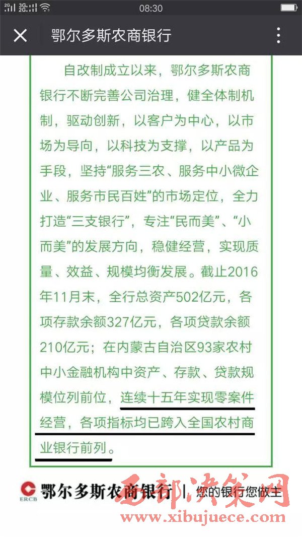 鄂爾多斯農(nóng)商銀行官方微信平臺2016年12月22日發(fā)布文章中稱:鄂爾多斯農(nóng)商銀行自改制成立以來,連續(xù)十五年實(shí)現(xiàn)零案件經(jīng)營,各項(xiàng)指標(biāo)均已跨入全國農(nóng)村商業(yè)銀行前列。