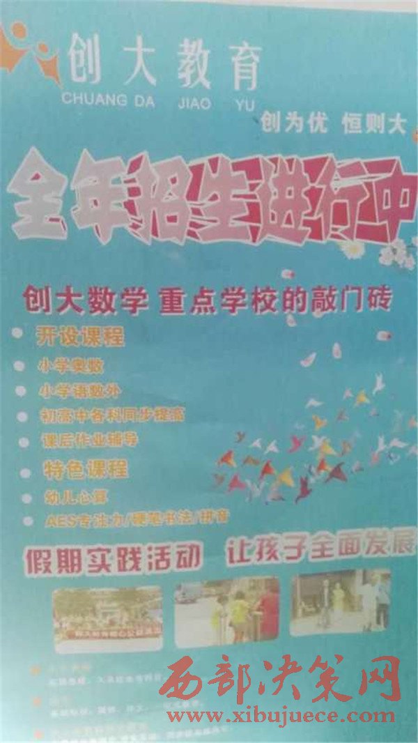 家長為了讓孩子能全面發(fā)展,常年穿梭于各類興趣、輔導(dǎo)班而樂此不疲。有的家長為了讓孩子上個好學(xué)校,托熟人、找關(guān)系,掏天價(jià)送孩子上所謂的名優(yōu)輔導(dǎo)機(jī)構(gòu),而實(shí)際上實(shí)屬無奈,敢恨不敢言,這一現(xiàn)象不得不讓人深思……!實(shí)際情況到底怎樣?本社工作人員根據(jù)群眾反映近期對一家名為“創(chuàng)大教育”的輔導(dǎo)班進(jìn)行實(shí)地了解,結(jié)果讓人大跌眼鏡。