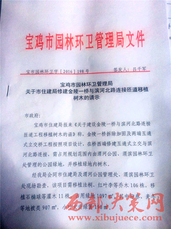 寶雞市人民政府副市長(zhǎng)王琳于2017年1月4日做出了批復(fù):“擬同意市園林環(huán)衛(wèi)局意見(jiàn),建議由市住建局做好涉及苗木移植,市園林環(huán)衛(wèi)局做好移植監(jiān)督檢查和技術(shù)把關(guān),確保樹木成活”。