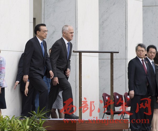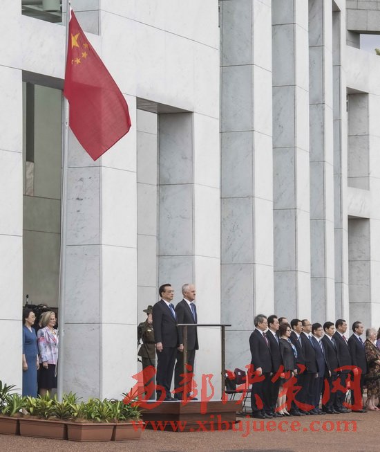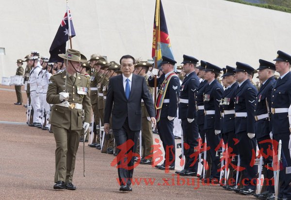當地時間23日上午,澳大利亞總理特恩布爾在堪培拉議會大廈廣場舉行隆重儀式,歡迎李克強總理對澳進行正式訪問。19響禮炮聲中,特恩布爾夫婦在下車處迎接李克強夫婦。廣場上奏響中國國歌,李克強檢閱了儀仗隊。兩國總理登上檢閱臺后,軍樂團再次奏響中澳兩國國歌。