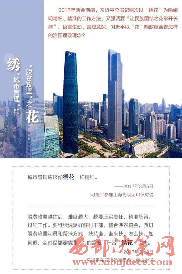 二繡脫貧攻堅:“全過程都要精準,有的需要下一番‘繡花’功夫。”3月8日,習近平在四川代表團談脫貧攻堅,再次以“繡花”為喻。