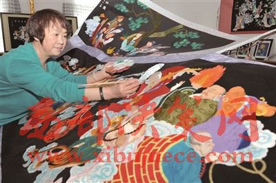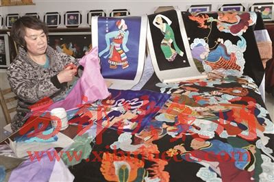 現(xiàn)任青海省民間工藝美術(shù)大師、國家非物質(zhì)文化遺產(chǎn)湟中堆繡的青海省代表性傳承人、湟中縣堆繡協(xié)會(huì)會(huì)長的喬應(yīng)菊,自幼酷愛民間工藝,三十年前經(jīng)塔爾寺三絕藝術(shù)之一的堆繡老藝僧智華恩師的傳授,她執(zhí)著追求,苦學(xué)至今,形成了她特有的堆繡造型和配色特色。她對記者說:“堆繡是一種運(yùn)用‘剪’、‘堆’技法塑造的獨(dú)特藝術(shù),用各色質(zhì)地不同的綢緞剪出人物、花鳥、山水等各種圖案,再根據(jù)設(shè)計(jì)需求逐一堆貼在黑色底子的大幅布幔上,形成了一個(gè)完整的畫面。堆繡分為‘平剪堆繡’和‘立體堆繡’,前者是將各色布料堆貼在事先設(shè)計(jì)好的圖案上,用彩線或金銀線鑲邊而成;后者則是用各色綢緞剪成佛像、人物、花卉等多種圖形,然后充塞羊毛或棉花,再用絲線繡織。堆繡整體圖案極富有立體感,人物形象逼真,畫面色調(diào)和諧,產(chǎn)生出豐富而生動(dòng)的立體感和織物特有的肌理感,具有浮雕式的藝術(shù)效果,深受人們的喜愛”。
