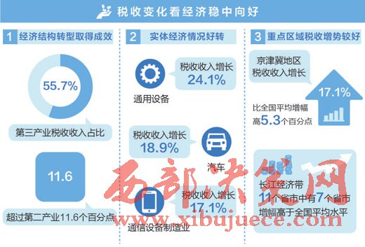 其中,現(xiàn)代服務業(yè)稅收增長強勁,顯示經濟結構轉型進一步取得成效:一季度第三產業(yè)稅收收入占比超過第二產業(yè)11.6個百分點,“尤其是現(xiàn)代服務業(yè)中互聯(lián)網服務、信息技術服務等信息產業(yè)蓬勃發(fā)展,稅收收入分別增長61.4%和42.1%。”鄭小英說。