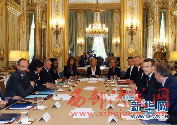 5月18日,在法國巴黎愛麗舍宮,法國總統(tǒng)馬克龍(右二)和總理愛德華·菲利普(左一)出席新一屆政府首次內(nèi)閣會(huì)議。