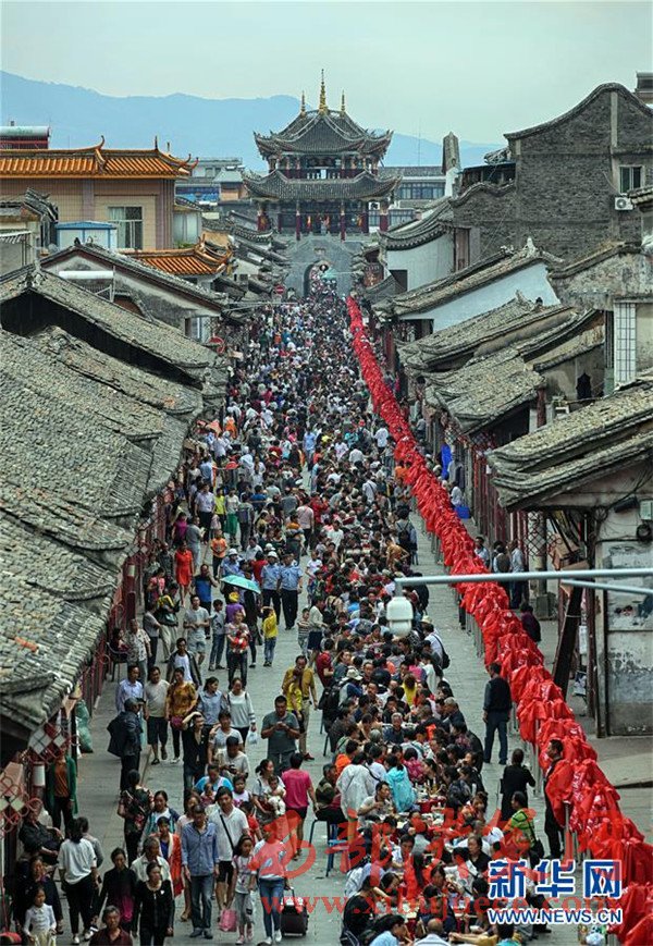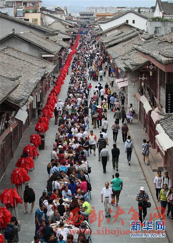 當日是端午節(jié),四川省涼山彝族自治州會理縣會理古城舉行“萬人藥根宴”,約1.5萬人共同在古城內(nèi)1500張桌上就餐。