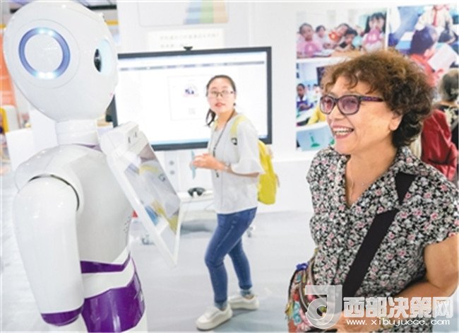 在首屆中國北京國際語言文化博覽會上,一名參觀者與智能客服機器人交流。 (