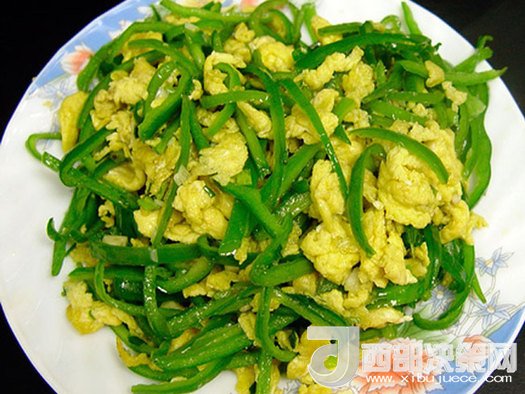 3、往鍋內(nèi)倒入余油,燒熱,放入蔥花熗鍋,隨著放入青椒絲,加精鹽炒幾下,見青椒絲翠綠色時(shí),放入炒好的雞蛋、味精,翻炒均勻,用香醋烹一下,即可出鍋。