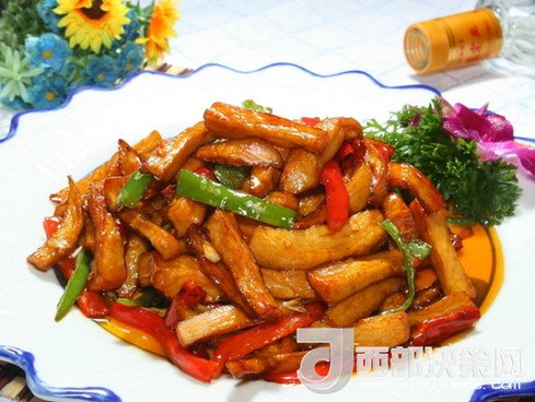 3. 炒鍋上火,加入花生油燒熱,放蔥絲爆鍋,加入干辣椒炒香,再加入青紅椒絲、土豆絲,炒至八成熟時(shí)加入精鹽、味精調(diào)味,再淋上香油和香醋,炒熟即可。