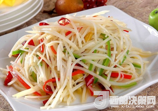 1. 將土豆削皮,切細(xì)絲,泡在水中洗去淀粉,既能避免其變黑,又能使其在炒燒時(shí)保持白嫩、爽脆。炒前撈出,瀝干水分。