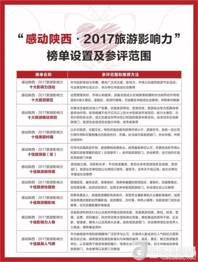 “感動陜西·2017旅游影響力”大型評選活動,既是對2017年陜西旅游業(yè)的綜合評估和優(yōu)勢品牌項目的一次集中梳理和聯(lián)動推廣,評選活動設(shè)置了2017年“十大影響力活動”、“十大旅游景區(qū)”、“十大旅游推動力項目”、“十佳美麗村鎮(zhèn)”、“十佳旅游縣(區(qū))”、“十佳旅游微傳媒”、“十佳旅游住宿地”、“十佳旅游攝影地”、“十佳影響力人物”、“十佳最具人氣榜”10類項目,采取社會推薦、自主申報、專業(yè)推選、游客調(diào)查、網(wǎng)民評選、社會公示、大眾點評、數(shù)據(jù)分析等方法得出評選結(jié)果,于2018年1月通過大型盛典對外公布,使其成為載入史冊的2017年度陜西旅游業(yè)優(yōu)勢品牌榜單。