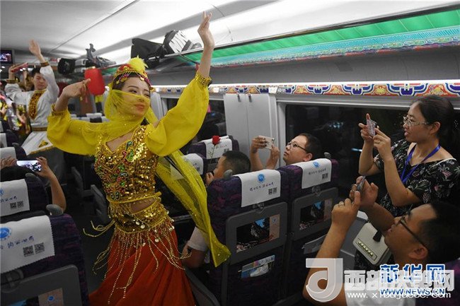 蘭州客運段列車員在蘭州鐵路局開行的首趟寶蘭高鐵G2028次動車組上為旅客表演節(jié)目(7月9日攝)。7月9日,寶雞至蘭州高鐵正式開通運營,西北的甘肅、青海、新疆由此融入全國高鐵大家庭。