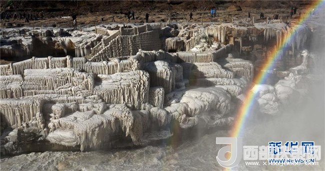 這是12月17日在山西吉縣黃河壺口瀑布拍攝的冰瀑彩虹景觀。當(dāng)日,黃河壺口瀑布出現(xiàn)彩虹景觀。壺口瀑布兩岸姿態(tài)萬千的冰瀑,與瀑布上空的彩虹相映成趣,美不勝收。(呂桂明 攝)