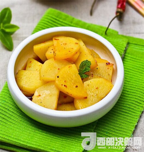 6.將調(diào)料澆入土豆片即可,其實(shí)這個(gè)菜還有一個(gè)做法,可以將調(diào)料中加上高湯和復(fù)合調(diào)料油,將土豆片浸泡,味道更加美,家庭操作通常以簡單易行為好。