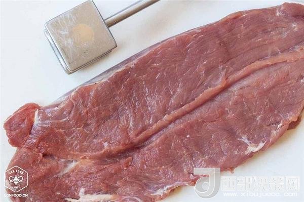 4、將農(nóng)畉豬里脊肉沿邊緣切開(kāi),像一本書一樣打開(kāi),先用保鮮膜覆蓋,再用木槌或搟面杖輕輕敲打,直到它厚度均勻;