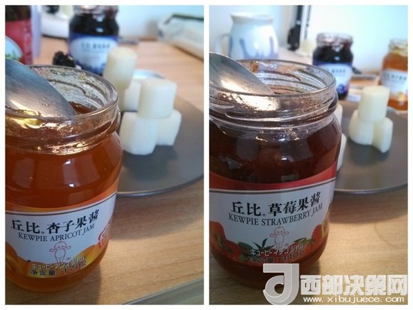 5、為了顏色漂亮,一個淋上杏子果醬;6、最后一個淋上草莓果醬即可。