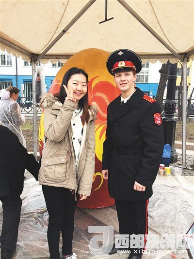 在俄羅斯的節(jié)日慶典活動中,姜若晨(左一)與當(dāng)?shù)剀娦W(xué)生的合影。在她看來,學(xué)子與外國朋友的交往過程中要注重自身形象,傳遞中國微笑。