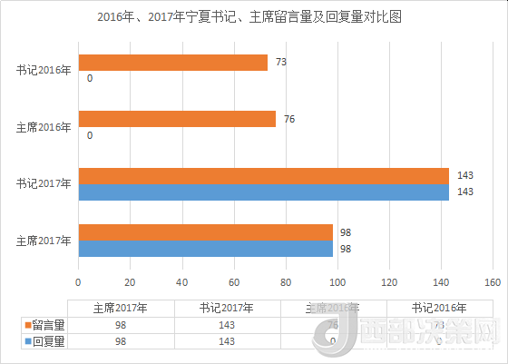 據(jù)統(tǒng)計,2017年,人民網網友分別給寧夏黨委書記、政府主席公開留言143條和98條,同期增長幅度較大,其中書記留言量增長49%。值得點贊的是,書記、主席全年的回復率達100%,各項數(shù)據(jù)均創(chuàng)新高。