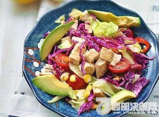 越吃越瘦的減脂餐——烤雞肉牛油果沙拉牛油果切片,沙拉菜洗凈放入大碗中,烤好的雞胸肉切成小塊,放入沙拉碗,倒入沙拉汁拌勻即可。