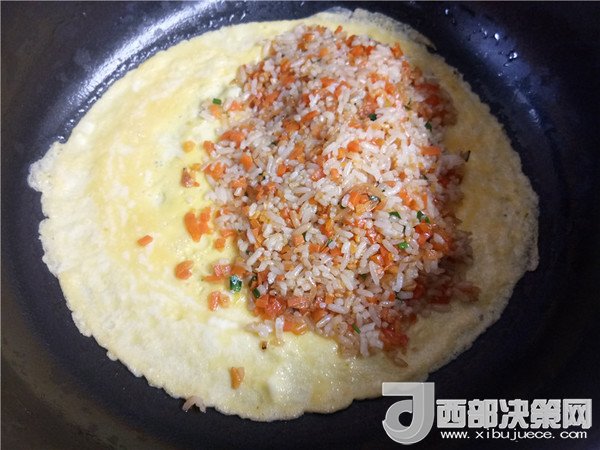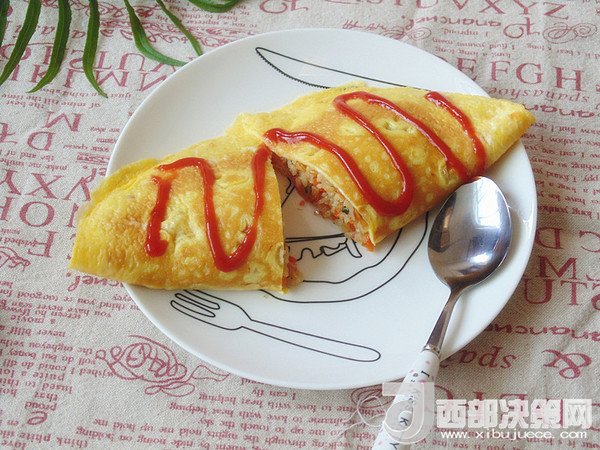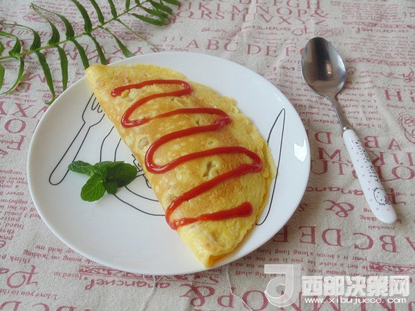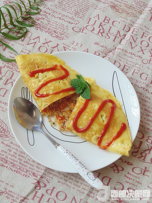14.將炒好的飯倒入煎好蛋皮的一側(cè),另一邊折過來邊緣對齊。擠上番茄沙司裝飾即可開吃。