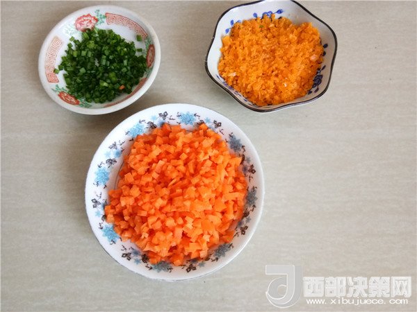 3.將胡蘿卜切成小丁、蔥切成蔥花、咸蛋碾成碎末。