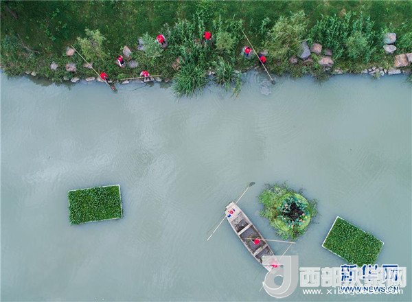 在浙江省長興縣劉家渡河道南太湖段,河長帶領專職保潔人員進行日常的鄉(xiāng)村河道護理(2017年10月13日攝)。記者 徐昱 攝