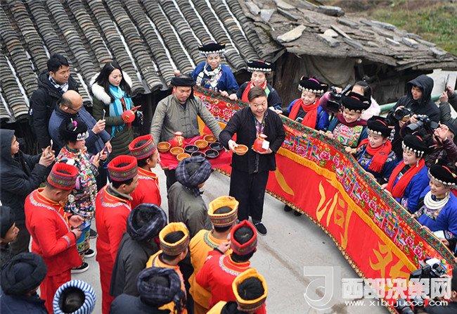 2018年2月4日,在湖南省湘西土家族苗族自治州花垣縣十八洞村,新郎的迎親隊伍遇上新娘親友攔門。當日,兩對分別來自湘西和湘潭的新人特地來到十八洞村體驗苗族婚禮。新華社發(fā)(薛宇舸 攝)