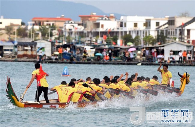 運動員參加在海南萬寧和樂鎮(zhèn)港北港舉行的2016中華龍舟大賽萬寧站比賽(2016年3月10日無人機拍攝)。新華社記者 楊冠宇 攝