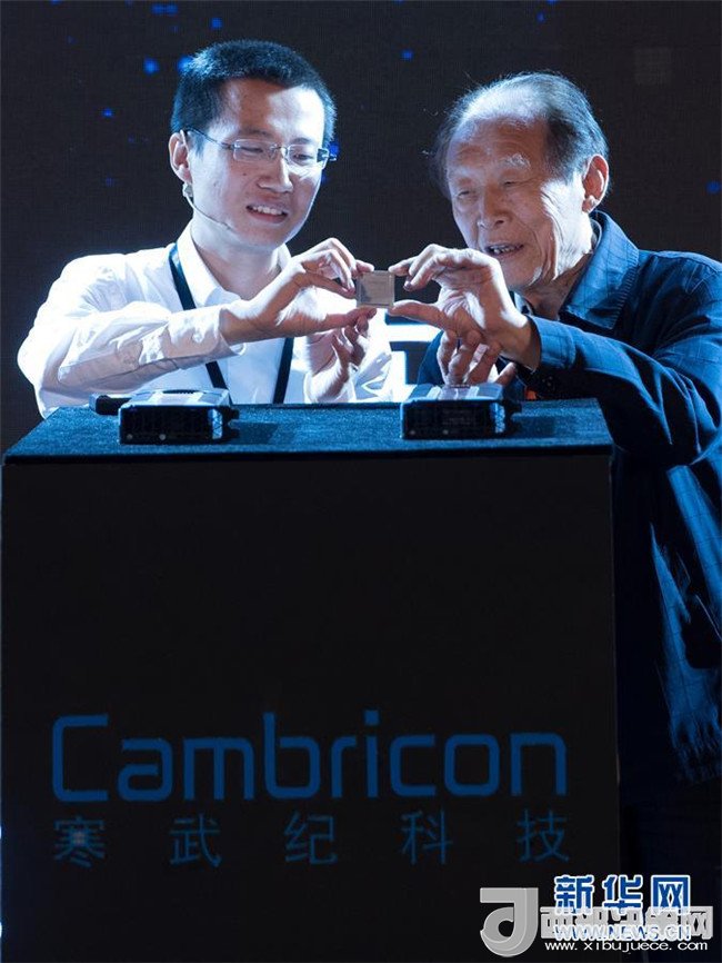 5月3日,在上海國際會議中心舉行的發(fā)布會上,寒武紀科技公司首席執(zhí)行官陳天石(左)和他的老師、中科院院士陳國良一起發(fā)布芯片。