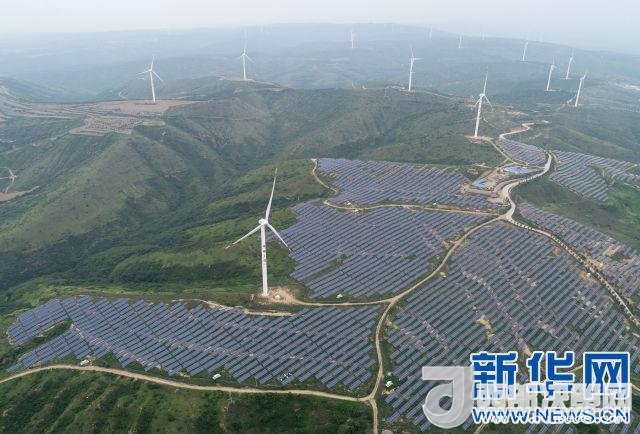 這是黃龍縣界頭廟鎮(zhèn)的風(fēng)力發(fā)電場和光伏發(fā)電項(xiàng)目(6月1日無人機(jī)拍攝)。新華社記者邵瑞攝