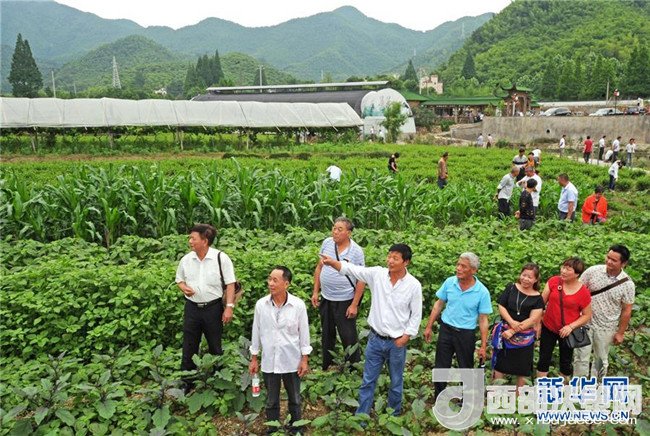 6月3日,安吉縣余村村民俞金寶(前左四)向參觀者介紹他創(chuàng)辦的生態(tài)農(nóng)業(yè)觀光園。新華社記者 譚進 攝