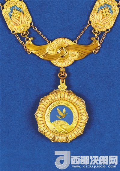 根據(jù)《中華人民共和國國家勛章和國家榮譽(yù)稱號法》,國家設(shè)立中華人民共和國“友誼勛章”。中華人民共和國“友誼勛章”章體以金色、藍(lán)色為主色調(diào),采用和平鴿、地球、握手、荷花等元素,章鏈采用中國結(jié)、萬年青、牡丹花、玉璧、蘭草等元素,整體采用花絲鑲嵌、掐絲琺瑯等傳統(tǒng)工藝手工制作。圖為中華人民共和國“友誼勛章”。新華社發(fā)