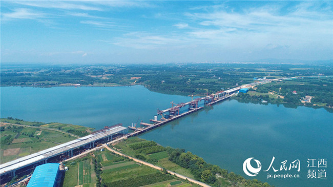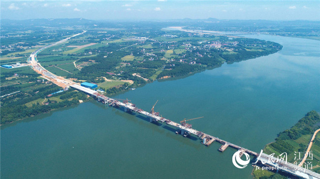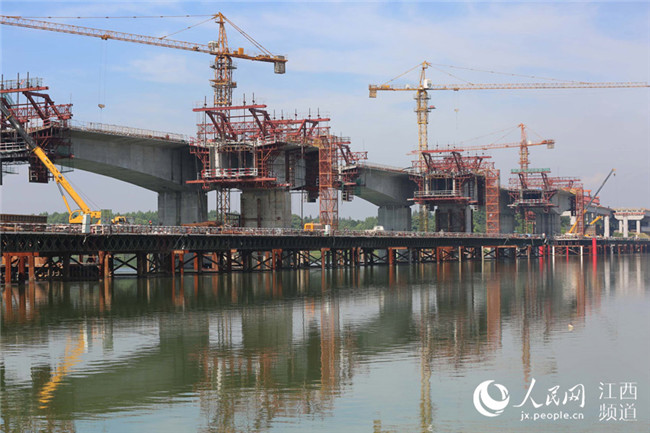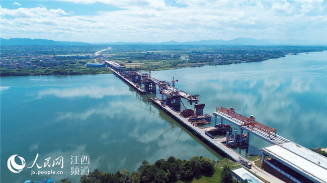 7月17日電17日上午,廣吉高速公路江西泰和北贛江特大橋正在進行掛籃施工作業(yè),在藍天白云、綠水青山襯托下,顯得格外美麗壯觀。泰和北贛江特大橋位于江西省泰和縣萬合鎮(zhèn),是廣吉高速公路唯一一座特大橋,是全線控制性工程,大橋總長1075米,總投資近1.5億元。大橋自2016年11月開工建設以來,工程進展順利,預計于今年底前建成合龍,為廣吉高速2019年1月如期建成通車奠定基礎。