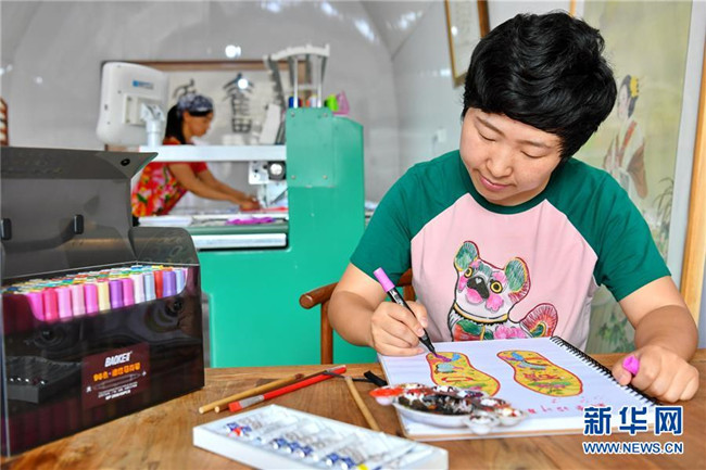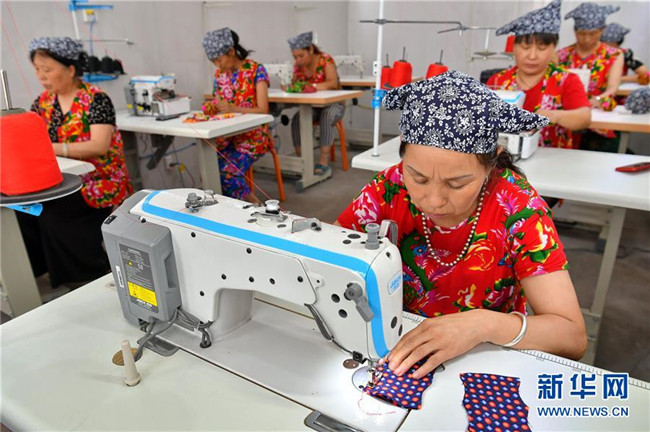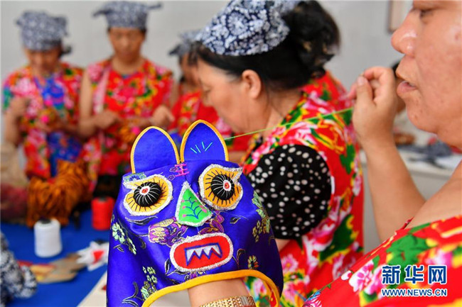 山西省臨縣寨則坪村是呂梁山上典型的貧困村。2017年5月,該村邀請縣里的老手藝人對10余位婦女進行布藝加工的集中培訓(xùn),并在村委院子里建起了布藝加工廠??恐庸じ挥挟?dāng)?shù)靥厣男瑝|、肚兜、布老虎等工藝品,這些婦女每月能拿到1500元的工資,這幫助她們順利摘下了“窮帽子”。新華社記者 曹陽 攝