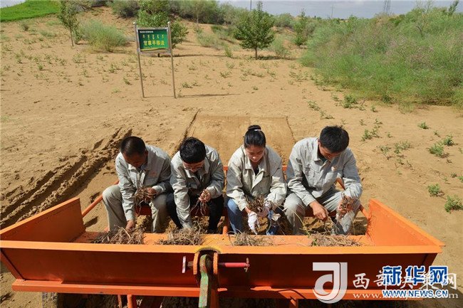 技術(shù)人員在位于內(nèi)蒙古鄂爾多斯市杭錦旗的庫(kù)布其沙漠示范甘草平移法(7月24日攝)。