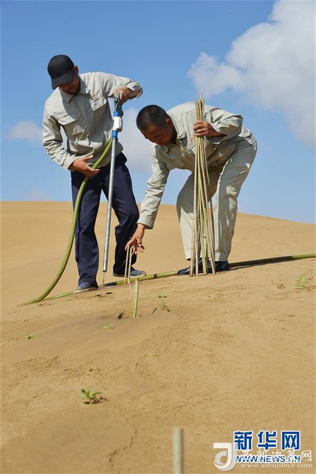 億利集團(tuán)生態(tài)事業(yè)部職工在庫(kù)布其沙漠中利用螺旋鉆孔植樹法種樹(7月11日攝)。用這種方法30秒可種下一棵樹。 新華社記者 彭源 攝