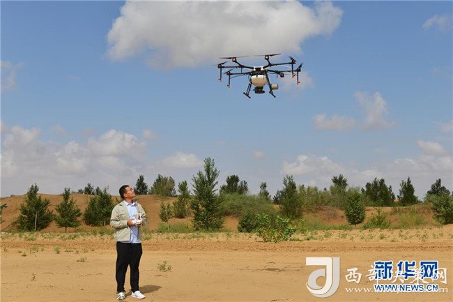技術(shù)人員在位于內(nèi)蒙古鄂爾多斯市杭錦旗的庫(kù)布其沙漠里示范無(wú)人機(jī)植樹(7月24日攝)。 新華社記者 鄒予 攝