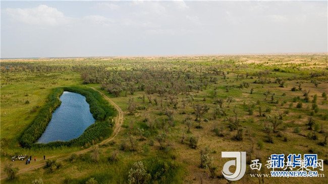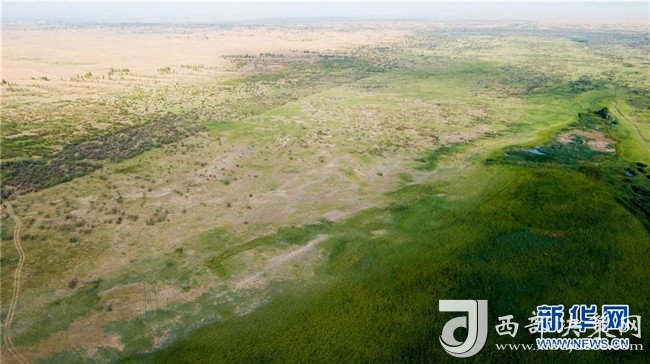 這是位于庫(kù)布其沙漠中的七星湖沙漠生態(tài)旅游區(qū)(7月11日無(wú)人機(jī)拍攝)。 新華社記者 彭源 攝