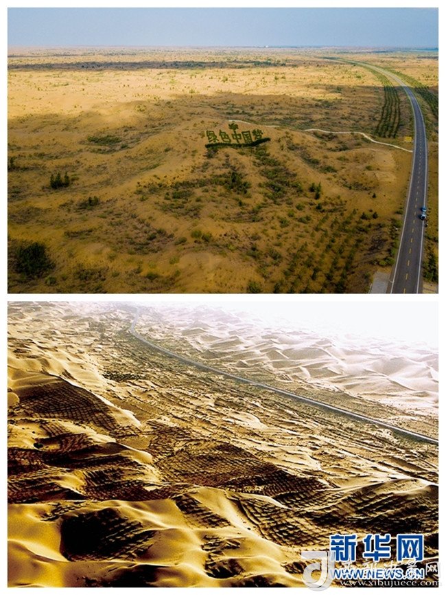 這是內(nèi)蒙古鄂爾多斯市杭錦旗庫(kù)布其沙漠穿沙公路周邊環(huán)境的對(duì)比(拼版照片:上為2018年7月11日新華社記者彭源攝;下為資料照片)。 新華社發(fā)