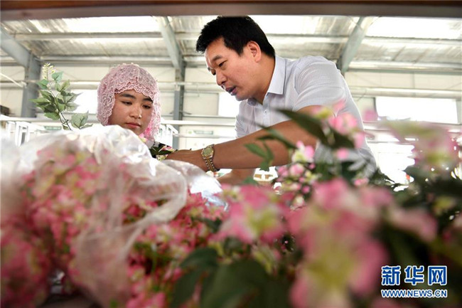 潘文賢(右)在寧夏固原市隆德縣隆德人造花工藝有限公司向員工介紹人造花制作技術(shù)(8月29日攝)。來自福建南安市的潘文賢2011年在隆德縣創(chuàng)辦隆德人造花工藝有限公司,成為隆德縣第一家集研發(fā)、生產(chǎn)和銷售于一體的勞動密集型出口創(chuàng)匯企業(yè),產(chǎn)品遠銷歐美及東南亞等國家和地區(qū)。截至2017年底,已成功打造隆德縣前莊村、紅崖社區(qū)等5個扶貧車間,幫助150人穩(wěn)定就業(yè)、218戶外加工戶靈活增收,帶動300多個建檔立卡戶增收脫貧。 新華社記者郭緒雷攝