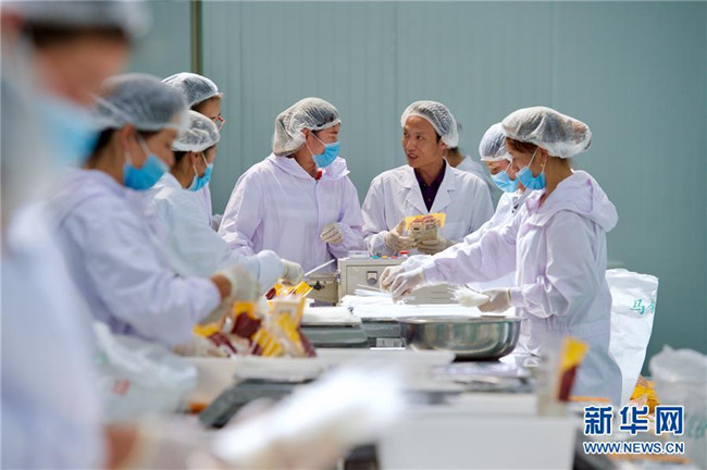 黃玉仁(右三)在寧夏固原市隆德縣寧夏黃土地農(nóng)業(yè)食品有限公司與員工交流馬鈴薯產(chǎn)品包裝注意事項(8月29日攝)。來自福建莆田的黃玉仁2017年在隆德縣創(chuàng)辦寧夏黃土地農(nóng)業(yè)食品有限公司,利用當?shù)伛R鈴薯種植優(yōu)勢,制作馬鈴薯深加工產(chǎn)品,促進當?shù)伛R鈴薯銷售和農(nóng)民增收。目前公司已建成4條生產(chǎn)線,為當?shù)?0多名百姓解決就業(yè)。 新華社記者姜克紅攝