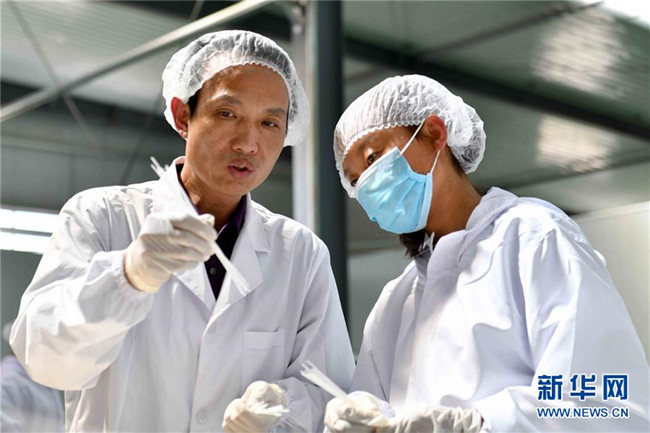 黃玉仁(左)在寧夏固原市隆德縣寧夏黃土地農(nóng)業(yè)食品有限公司與員工交流馬鈴薯粉絲制作技術(shù)(8月29日攝)。來自福建莆田的黃玉仁2017年在隆德縣創(chuàng)辦寧夏黃土地農(nóng)業(yè)食品有限公司,利用當?shù)伛R鈴薯種植優(yōu)勢,制作馬鈴薯深加工產(chǎn)品,促進當?shù)伛R鈴薯銷售和農(nóng)民增收。目前公司已建成4條生產(chǎn)線,為當?shù)?0多名百姓解決就業(yè)。 新華社記者郭緒雷攝