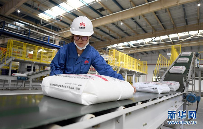 延安煤油氣資源綜合利用項(xiàng)目包裝車(chē)間的工作人員進(jìn)行產(chǎn)品包裝檢查(9月28日攝)。新華社記者 劉瀟 攝