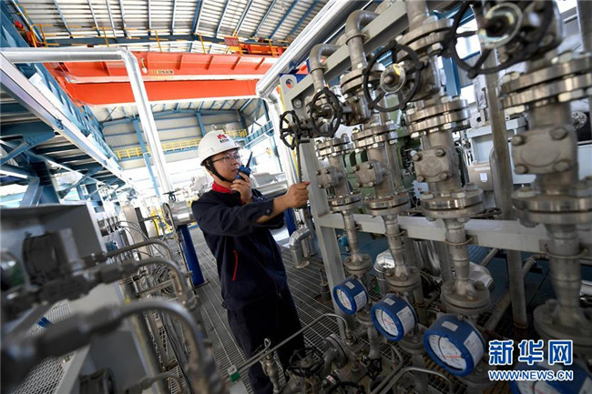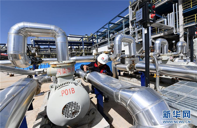 延安煤油氣資源綜合利用項(xiàng)目甲醇制烯烴中心的工作人員進(jìn)行設(shè)備巡檢(9月28日攝)。新華社記者 劉瀟 攝